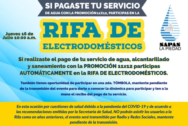 El Sistema de Agua Potable, Alcantarillado y Saneamiento de La Piedad (SAPAS), llevó a cabo la tradicional rifa de electrodomésticos para los usuarios que aprovecharon la promoción de pago anticipado 11×12 durante los tres primeros meses del año, que en este año tuvo una excepción de alargar hasta el mes de abril la promoción en…